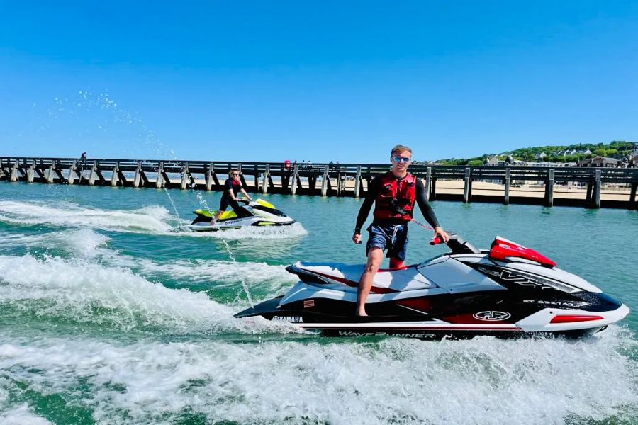 C’est parti pour 2 heures d’activité pendant laquelle vous allez alterner entre course en Zodiac surpuissant et jetski. Le concept? Vous partez tous ensemble en zodiac au large de Deauville, 2 Jetski vous suivent. Et c’est parti pour deux heures à fond : vous alternez autant que vous le souhaitez entre Zodiac et Jetski, sans limite.